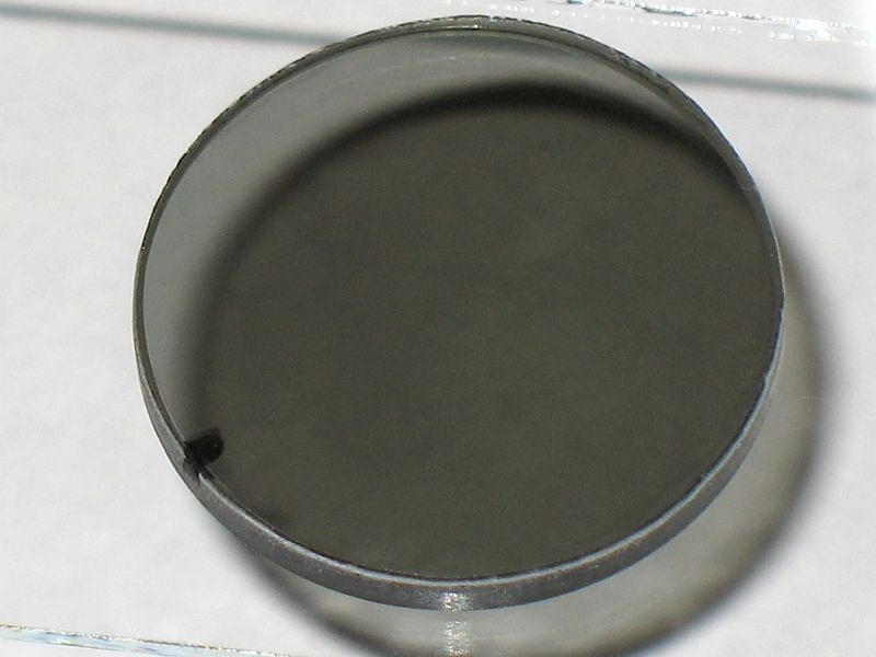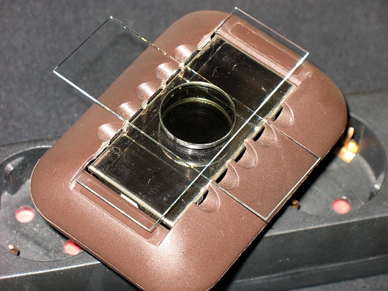 Auf dessen Heizfläche lege ich einen oder mehrere Objektträger (flinker bis träger Temperaturanstieg) und oben auf das Filterglas. Wenn alles gut temperiert ist, kommt ein kleiner Tropfen Kanadabalsam in die Mitte des Filterglases, darauf die Polfolie und als 'durchsichtiges' Gewicht ein weiterer Objektträger. Der Durchmesser der Polfolie ist ungefähr einen Millimeter größer als das Filterglas. Somit darf die Folie leicht verrutschen und austretendes Balsam -sollte aber grundsätzlich vermieden werden- verklebt nicht mit dem Gewicht. Noch bevor das Balsam Blasen schlägt, wird der Netzstecker gezogen und das "Sandwich" sich selbst überlassen. Die überstehende Folie dann mit einer feinen Diamant- oder Nagelfeile in nur einer Richtung (zum Glas hin) entfernt.