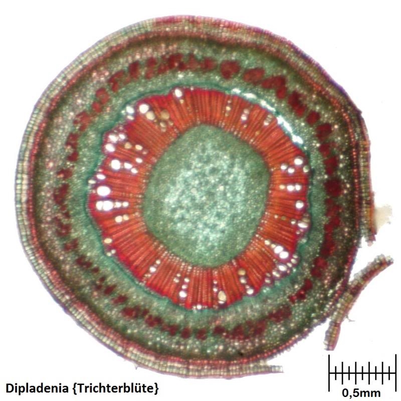 Objekt: Stängel-Querschnitt der Dipladenia {Trichterblüte}, Schnittdicke: ca. 30µm, Färbung: Etzold-grün, Eindeckmittel: Euparal