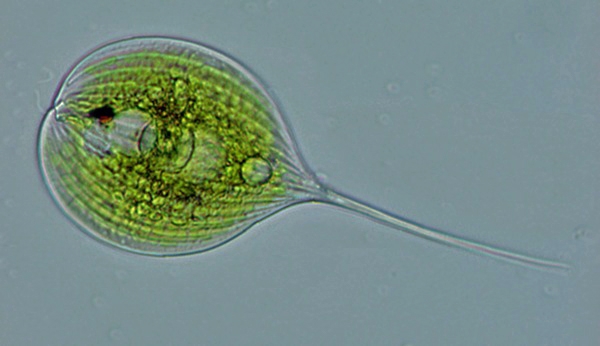 Ich bin mir nicht sicher, um was für ein Geisseltierchen es sich handelt. Das Tierchen schwimmt mit der Geissel, die einen Schlagtrichter bildet voraus und dass ziemlich schnell. Vielleicht handelt es sich um die Art Phacus longicanda.