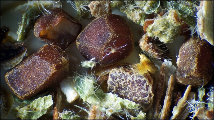 es sind doch keine Hagebuttenhaare. In der Probe finden sich etliche Haarbüschel, die definitiv an etwas anderem als einem Hagebuttennüsschen entspringen – stängelepidermale Herkunft ist eine Möglichkeit, da ich auf den Blattfragmenten nur Sternhaare finde.