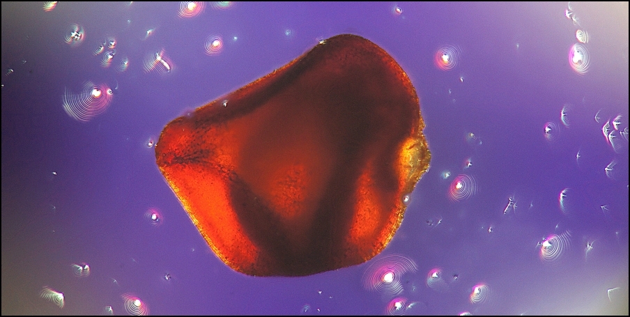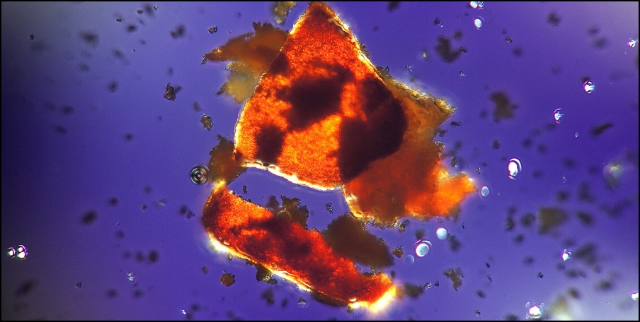 Jetzt hatte ich, in meiner ,,Harz-Hypothese" bestärkt, darauf gehofft, dass beim Erwärmen ein Anschmelzen der Körnchen und/oder eine Sublimation erfolgen würde. Nichts dergleichen passierte. Vielmehr zerplatzten und hüpften die Körnchen wie Popcorn. Dieses, zusätzlich zerdrückt, wird hier im Auflicht gezeigt: