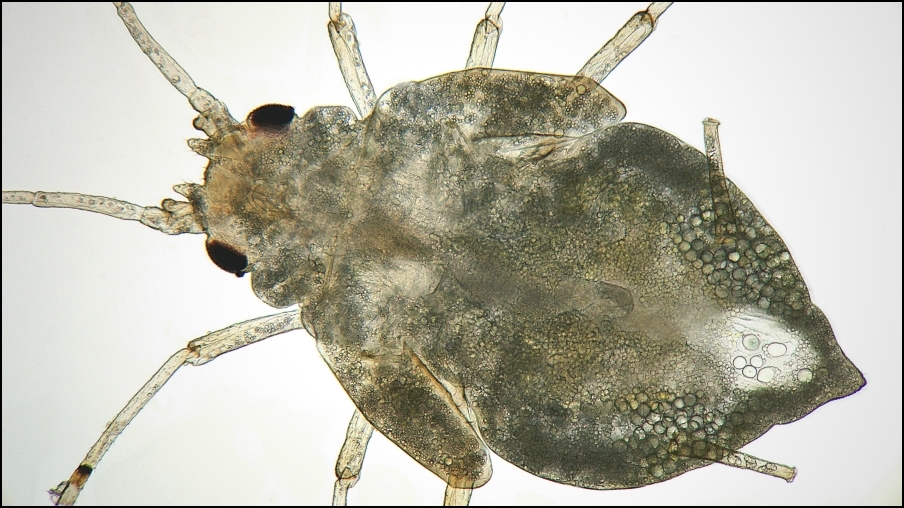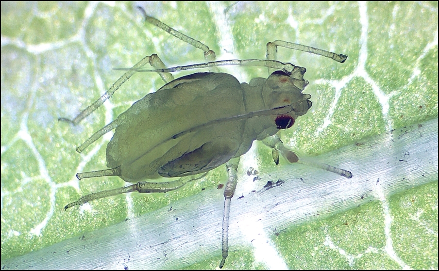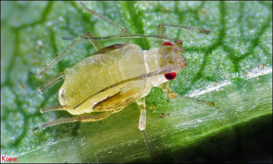 Röhrenblattlaus mit Flügelansätzen Durch erhöhte Temperaturen, kann die gelblich/grüne Färbung bis ins rötlich/braune gehen.
