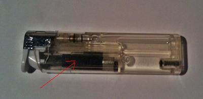 Dieses Piezo-Zündelement erzeugt beim zusammendrücken eine kleinen Blitz und lässt sich einfach ausbauen, einfach mit einen Schraubendreher die Blechkappe vom Feuerzeug herunter hebeln, danach fällt es fast schon von alleine heraus.