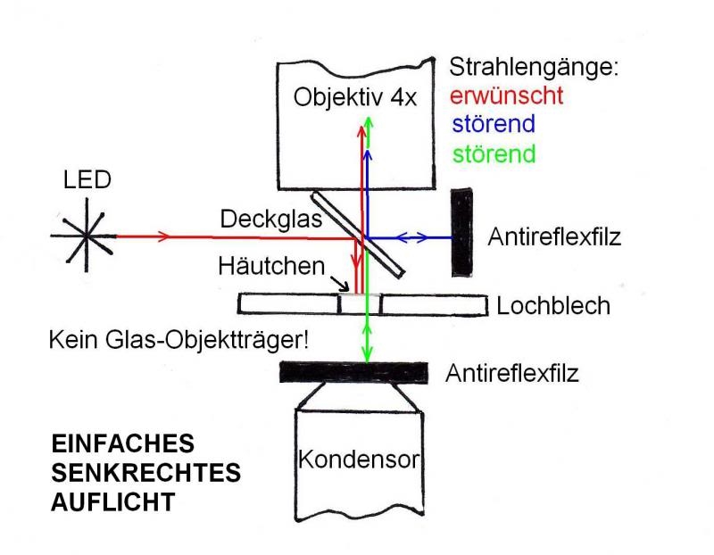 Dass Problem mit der unerwünschten Lichtreflektion des grün gekennzeichneten Strahlengangs ist bekannt. Da reflektiert die Kondensorlinse, was vielfach störend wirkt. Da genügt der Kondensor in die unterste Position zu fahren nicht immer. Auch das hast du auf elegante Art und Weise gelöst. Vielen Dank zu deiner Erklärung mit der Zeichnung.