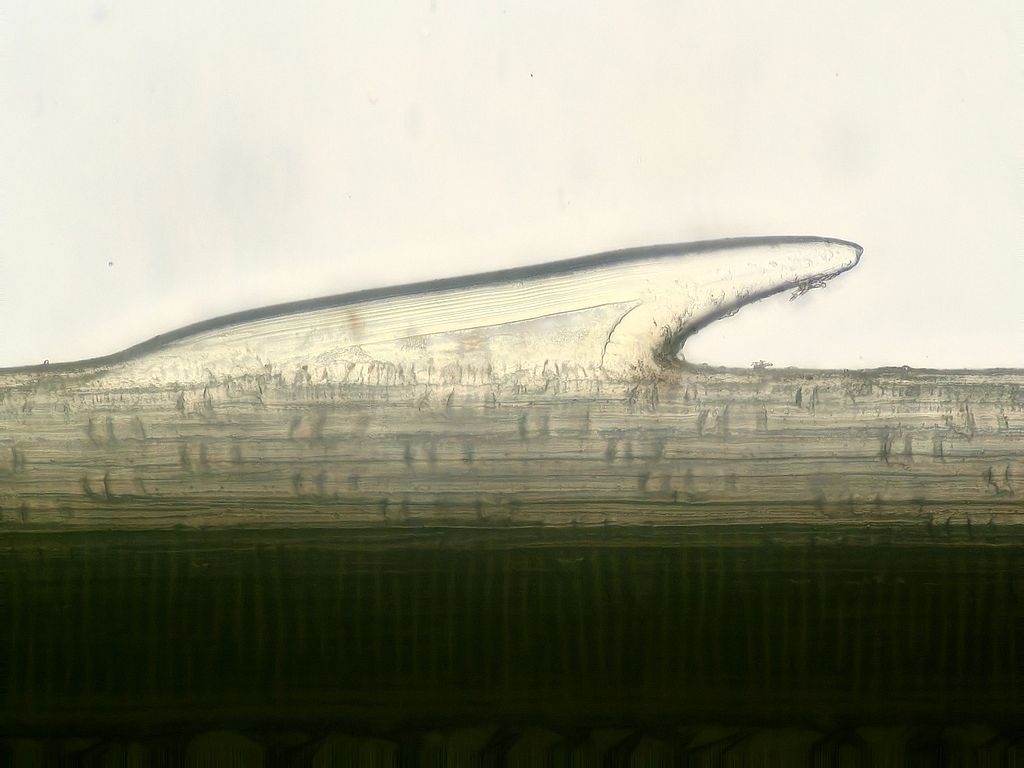 Quer angeschnitten erkennt man gut, dass es sich bei dem Zähnchen um eine einzelne, stark vergrößerte Zelle der Epidermis handelt. Sie hat bei einem Durchmesser von 76 auf 57 µm eine Wandstärke von ca. 23 µm und in der Mitte finden wir das Zelllumen mit etwa 35 * 12 mm.