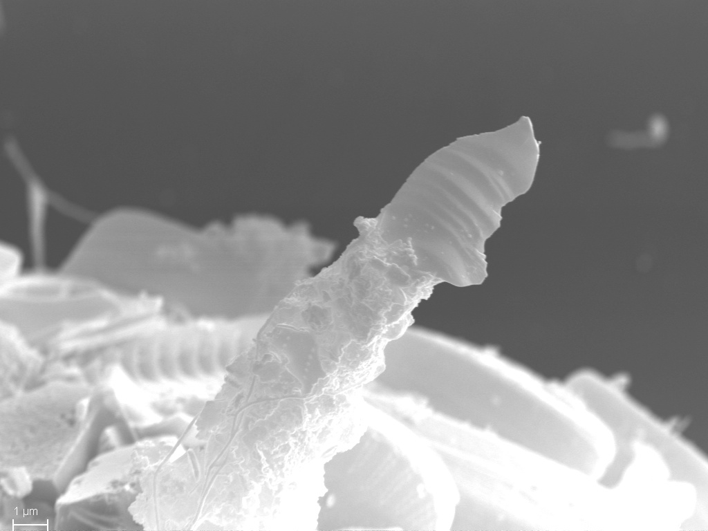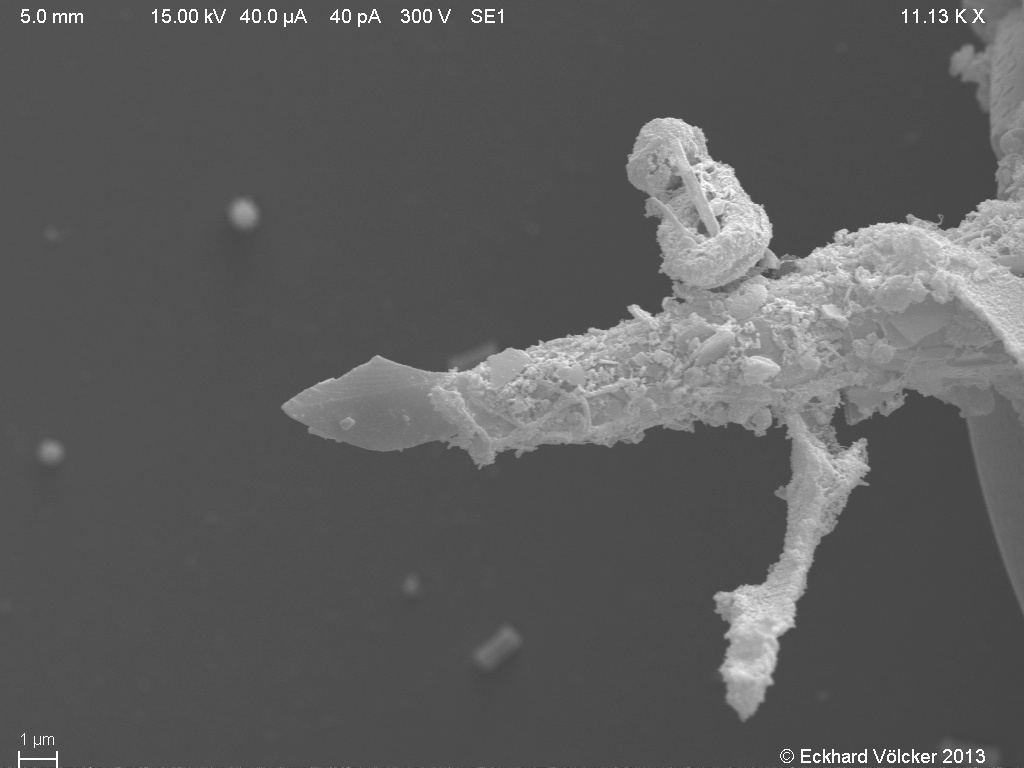 Wenn die Splitter nicht so winzig wären, würde ich sie als Archäologe für Menschenwerk halten. REM-Aufnahme 10 zeigt einen vielleicht Silex-Splitter mit den typischen Wallner-Linien, wie sie beim Abschlagen einer Klinge vom Kern entstehen. Kommt natürlich auch in der Natur vor, wenn genügend Druck auf einen Kiesel mit mehr oder weniger amorpher Struktur ausgeübt wird.