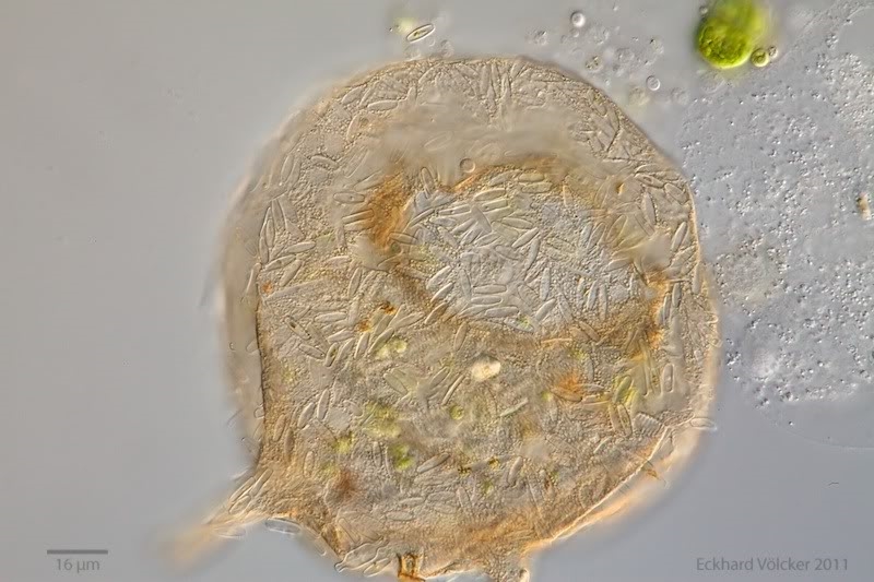die Stachel-Schalenamöbe Centropyxis ist jedem Tümpler sicherlich schon häufig begegnet. Besonders auffällig sind die Stacheln, die ich eher als Hörnchen bezeichnen würde. Nachfolgend erst einmal ein lichtmikroskopisches Bild.