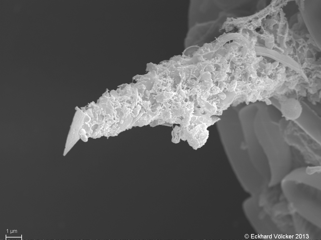 Im Elektronenmikroskop fallen die Hörnchen noch deutlicher auf. Anscheinend sind die Hörnchen hohl und werden von der Amöbe mit einem scharfen Gegenstand "verschlossen". Warum, weiss ich nicht. Nachfolgend ein paar Details der Hörnchen mit dem scharfen "Ende". Die Anzahl der Hörnchen variiert in Populationen der selben Art und die Unterscheidung der Arten ist problematisch.