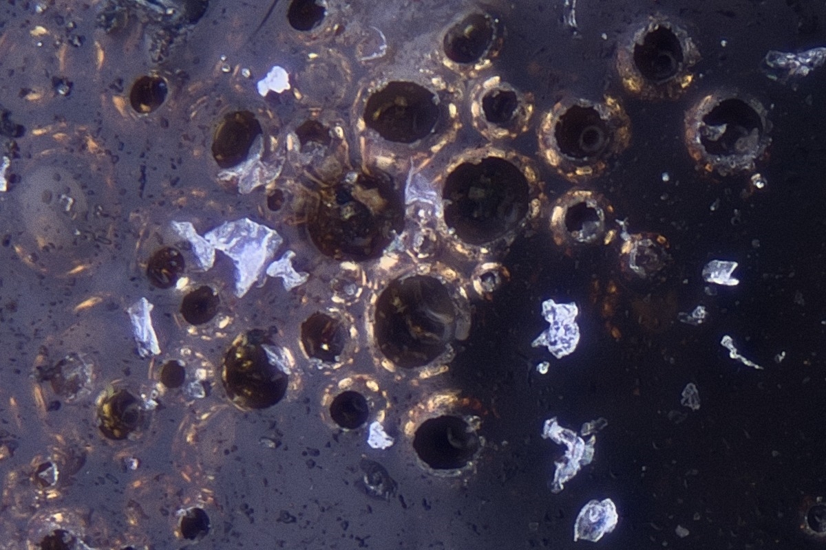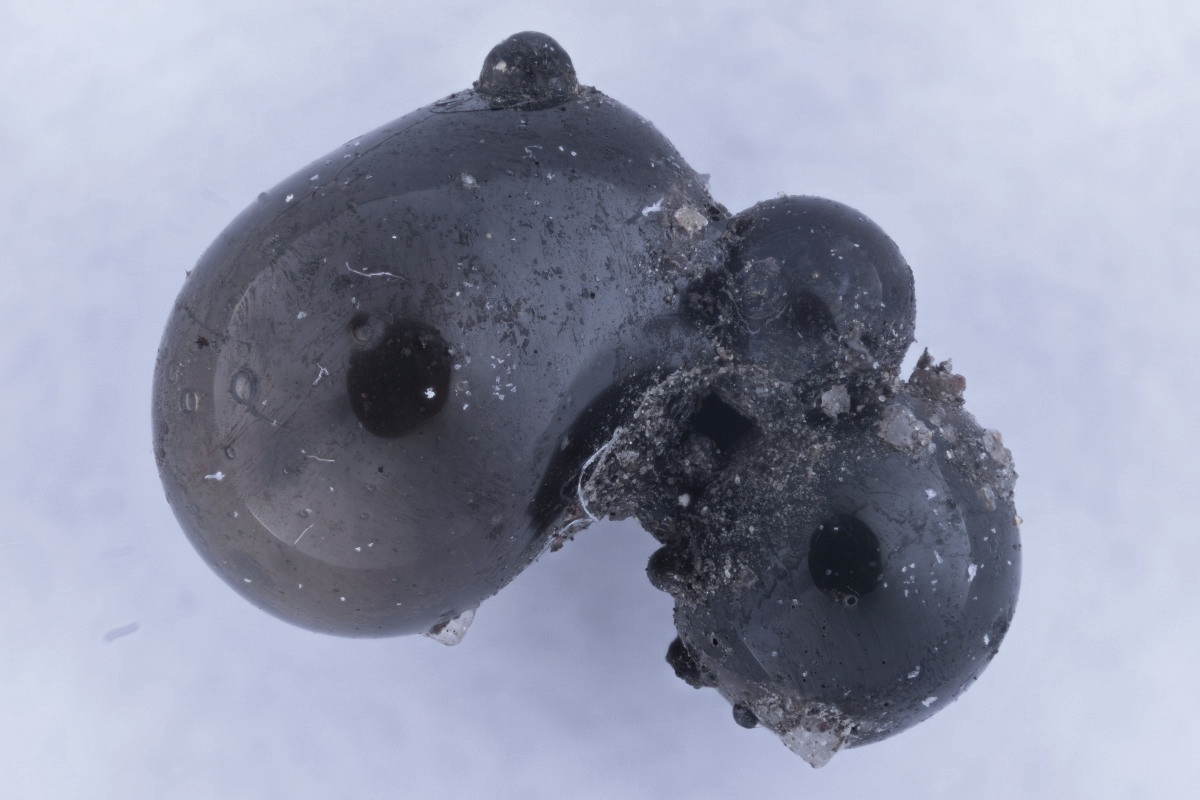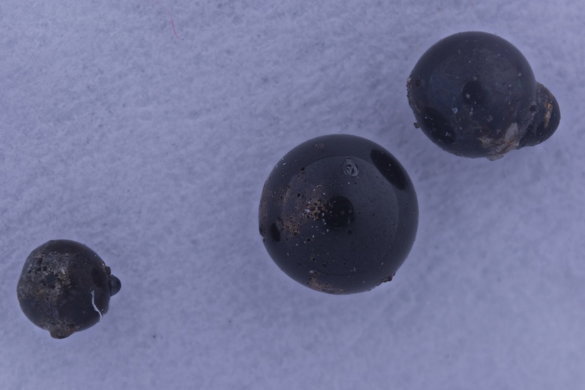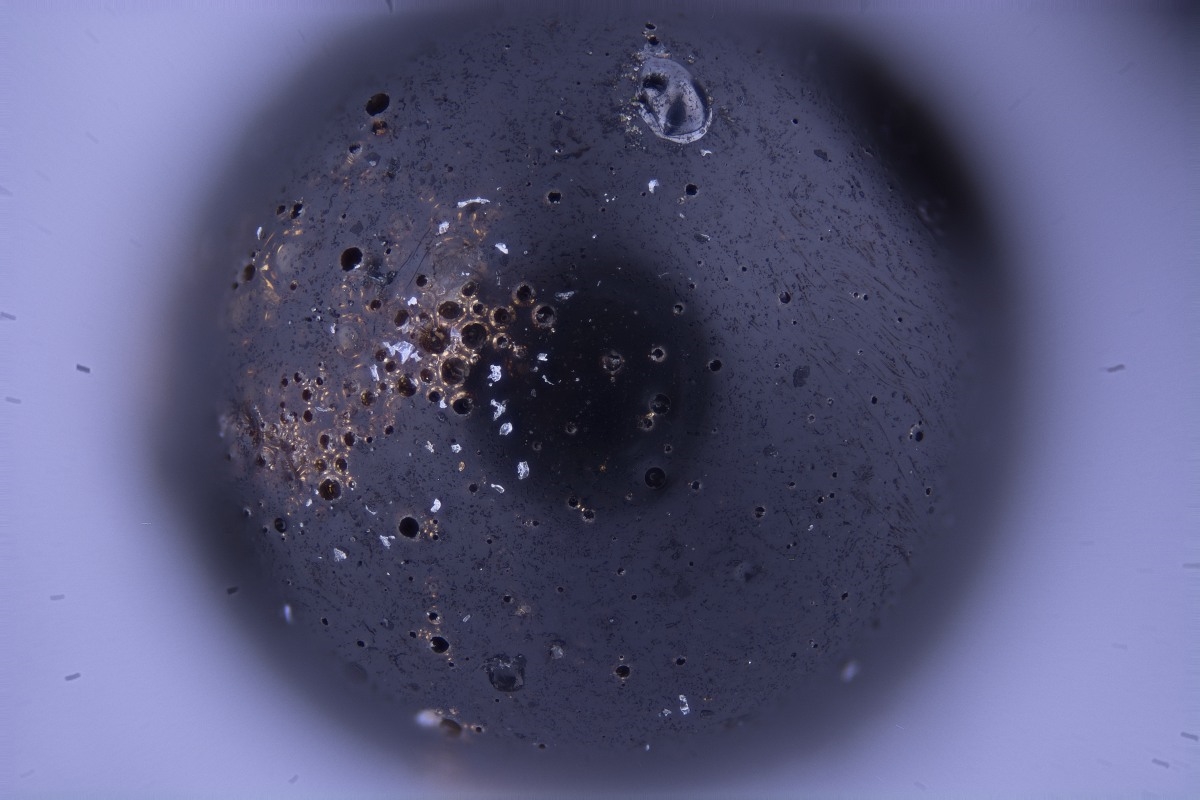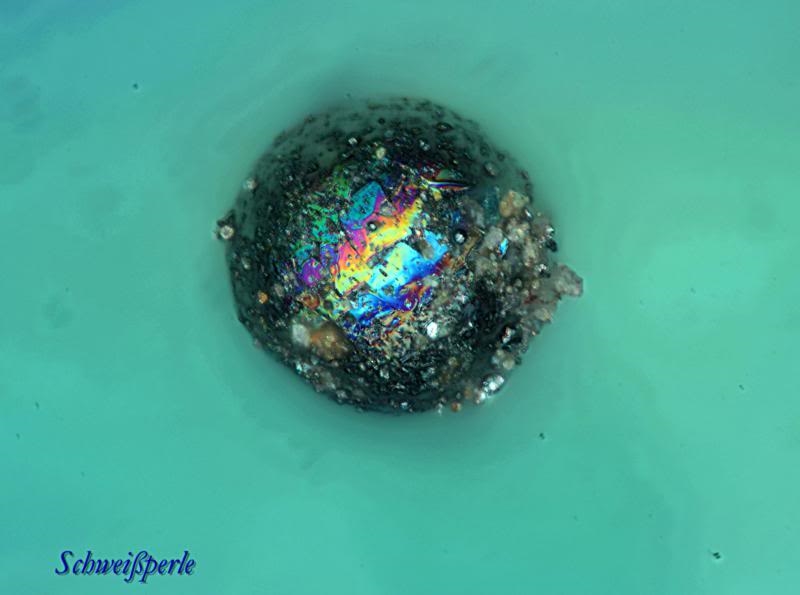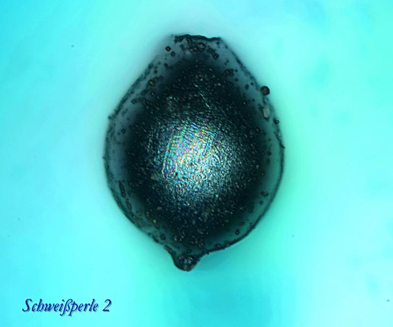der "Schlosserstaub" hat ja schon fast Schimmel angesetzt bei mir - ich habe ihn noch kurz vor Weihnachten gerettet, als die Werkstatt ausgekehrt wurde. In diesem Dreck gabs auch Schweißperlen und ich habe heute davon 2 unters Mikroskop gelegt. Sie sind nicht so glatt, wie die von Kurt, zeigen schon auch Kristallansätze, aber so schön ausgeprägt, wie auf den "Mikrometeoriten" aus der Atacama sind sie nicht. Meine Interpretation: die Abkühlrate ist bei den Schweißperlen viel höher, deshalb haben Kristalle kaum Zeit zu wachsen. Der Meteoritenabbrand hat in der heißen Abbrandhülle länger Zeit größere Krisalle zu bilden.