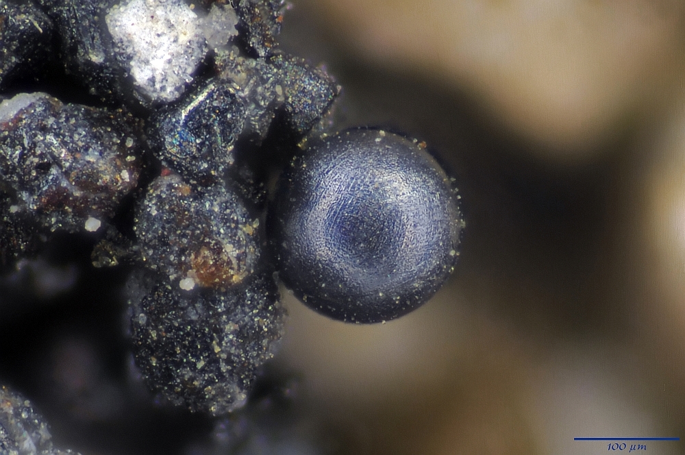 Ich meine, dass man auf den umliegenden Sandkörnchen auch einen Magnetitüberzug sieht(2. Bild von oben). Das deutet doch auf einen terrestrischen Schmelzprozess hin. Kann natürlich immer noch ein Impakt gewesen sein bei dem Eisen verdampft ist und sich oxidiert in feinen  Magnetit-Kügelchen abgeschieden hat.