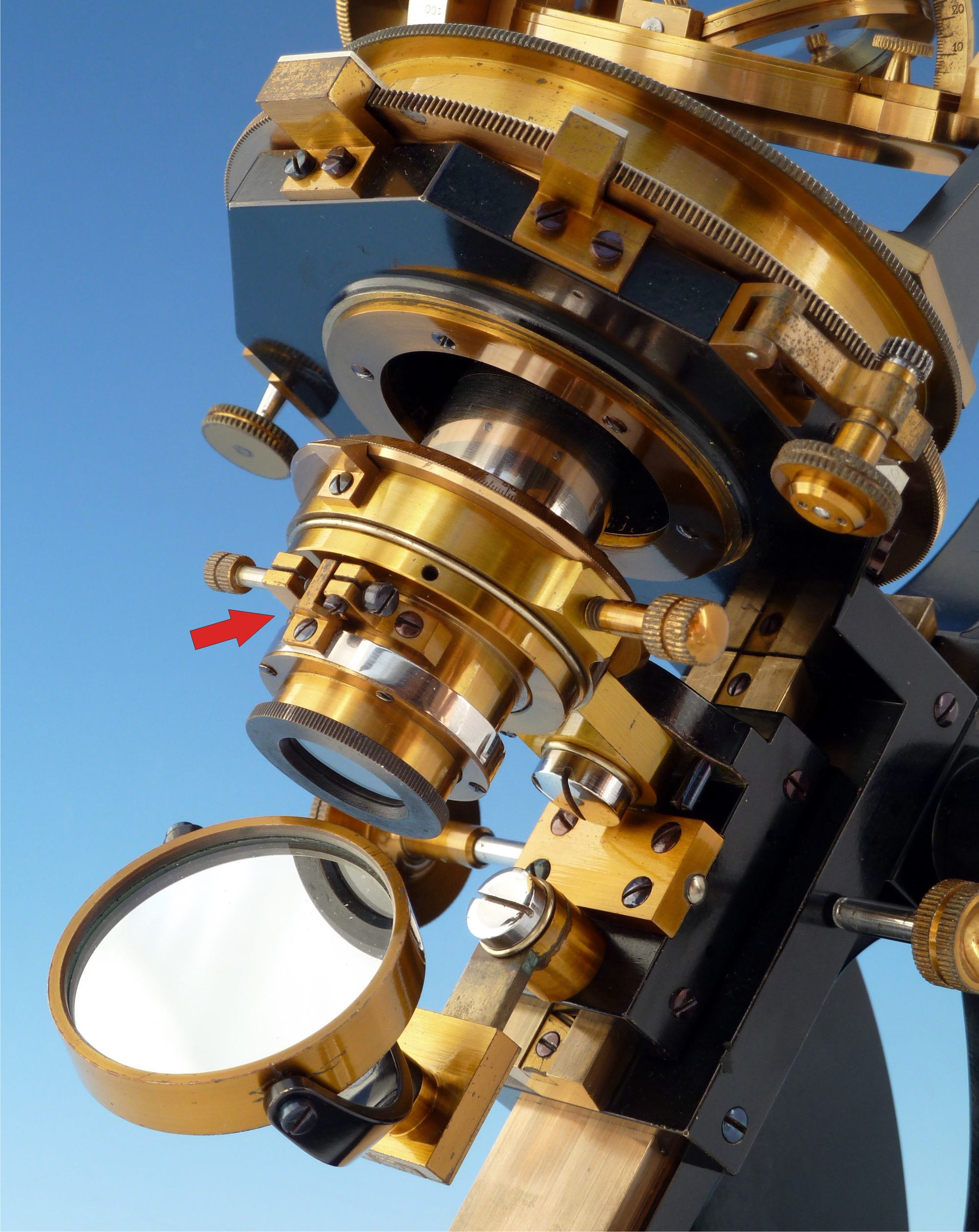 Als weitere Besonderheit gibt es eine Ausfräsung im Innentubus (roter Pfeil), in die Messplatten, Halbschattenplatten und Kompensatoren eingeschoben werden können. Diese befinden sich dann in der Ebene des reellen Zwischenbilds, genauso wie bei einem Wright-Okular. Wird dieser Schlitz nicht verwendet, kann er durch eine Drehhülse staubdicht verschlossene werden. Bei dieser Anwendung nutzt man ein spezielles Okular, das gleichfalls eine seitliche Ausfräsung hat.