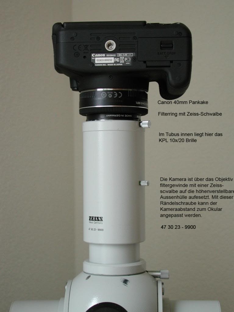 Ich habe an einem Zeiss Monokular - Tubus die Schwalbe entfernt. Dieses Stück wurde im Zentrum so weit aufgebohrt, dass sich in dieser Öffnung das Okular frei bewegen kann. Die dem Monokultur- Tubus zugewandte Seite wurde auf der Aussenseite soweit abgedreht, dass dort der Metallring eines Fotofilters mit Gewinde 52mm aufgesetzt und verklebt werden konnte. Dies ist nun das Verbindungsstück zwischen Tubus und Kameraobjektiv.