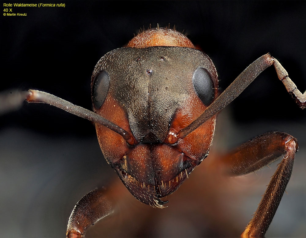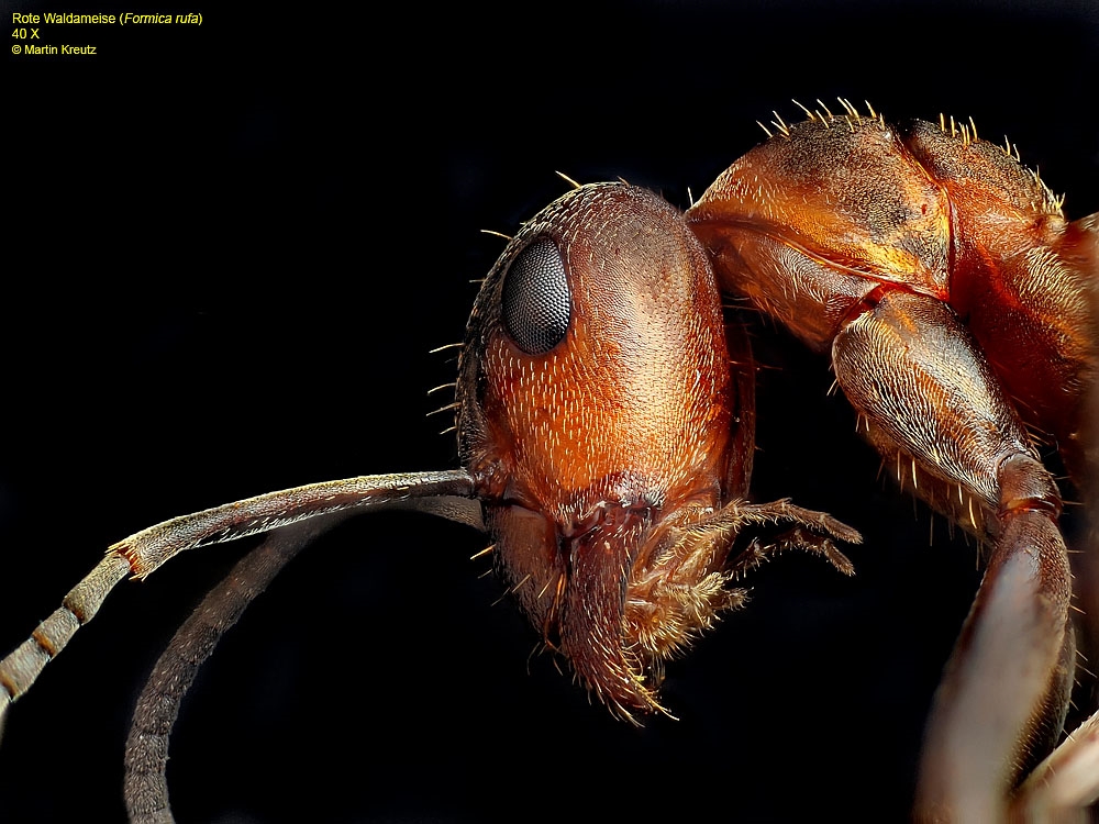 in meinem Tiefkühlschrank bewahre ich noch so einige Tierchen auf, für das eine oder andere Stacking-Experiment. Obwohl ich keine geeignete Ausrüstung besitzte, versuche ich immer wieder mal die nötige Versuchsanordnung unter mein 4X Objektiv zu quetschen um ein paar Stacks zu machen. Hier habe ich mal mein Glück an einer Roten Waldameise versucht. Mein Versuchsaufbau ist extrem simpel. Aus etwas Alufolie drehe ich einen "Draht". An das Ende des Drahtes klebe ich mit einem Tropfen Uhu die Ameise auf. Das andere Ende des Drahtes klebe ich mit einem Stück Tesa auf einem Objektträger auf. Ich biege den Draht dann so, dass die Ameise über den Rand des Objektträgers hinaus schaut. Dadurch gibt es beim späteren fotografieren keine Reflexionen durch das Glas des Objektträgers und ich kann alles mit dem Kreuztisch bewegen. Die Ameise hängt sozusagen über dem "Abgrund". Für das Objektiv verschwimmt der "Abgrund" (das ist der darunter liegende, runter gedrehte Kondensor), in völliger Unschärfe, was einen homogenen Hintergrund gibt. Über das Objektiv stülpe ich ein Fotodöschen ohne Boden. Diese Hülse lasse ich soweit runter bis die Ameise abgedeckt ist und fixiere es mit einem Stück Tesa. Dann fummel ich erstmal unter life Beobachtung mit einer Taschenlampe von außen rum, um eine geeigente Belichtungsposition zu finden. Der drehbare Kreuztisch hilft dabei. Wenn ich eine gefunden habe, ersetze ich die Lampe durch den Blitz (oft halte ich den einfach mit der Hand). Dann mache ich einige Testaufnahme für die korrekte Belichtung und dann geht es los. Ich habe mir keine Notizen gemacht, aber für die Ameisenbilder habe ich Stacks von ca. 40 Bildern gemacht, die nachher Picolay für mich zusammengefummelt hat.