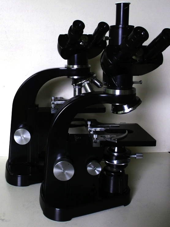 Bei den früheren Modellen waren alle Chromteile noch glänzend. Sie waren häufig mit einem kleineren koaxialen Kreuztisch und einem Leitz-typischen Schlittenkondensorhalter ausgestattet: