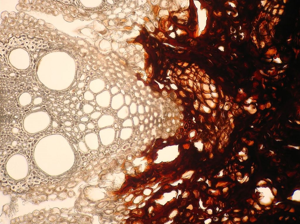Hier hat die Verstärkung der Zellwände durch Lignineinlagerung gerade erst begonnen. Beachtenswert die rot eingefärbten Zellzwischenräume oberhalb der vergrößerten Zellgruppe in Bild 18c. Liegen da die Pilzhyphen? Ich kann sie unter dem Mikroskop allerdings nicht entdecken.
