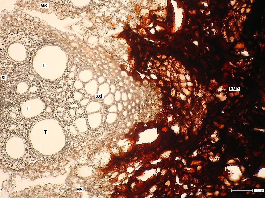 bMP steht hier für befallenes Markparenchym. Auffällig ist, dass - zumindest für mein ungeschultes Auge - keinerlei Hyphen zu erkennen sind.