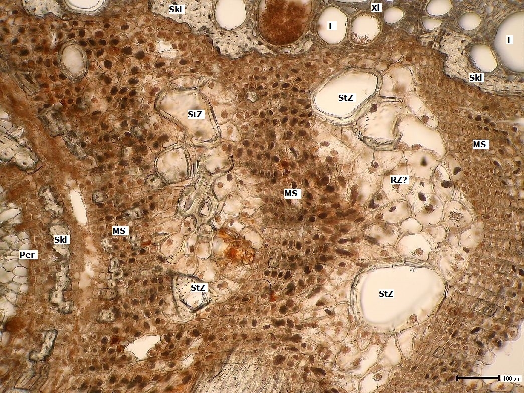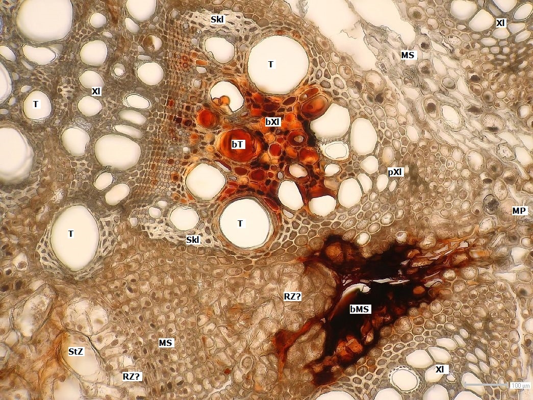Im gefärbten Bild 16c ist wieder gut die "Abwehrlignifizierung" der Pflanze in den Markstrahlzellen zu erkennen. Diese sind zum Teil auch vergrößert und wirken wie Steinzellen-Idioblasten.