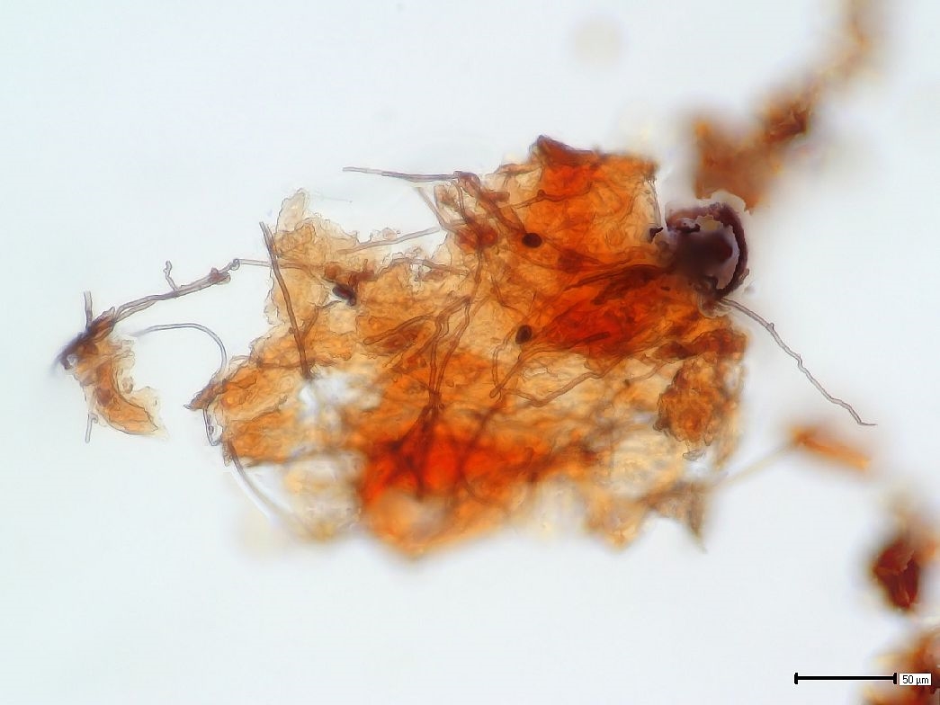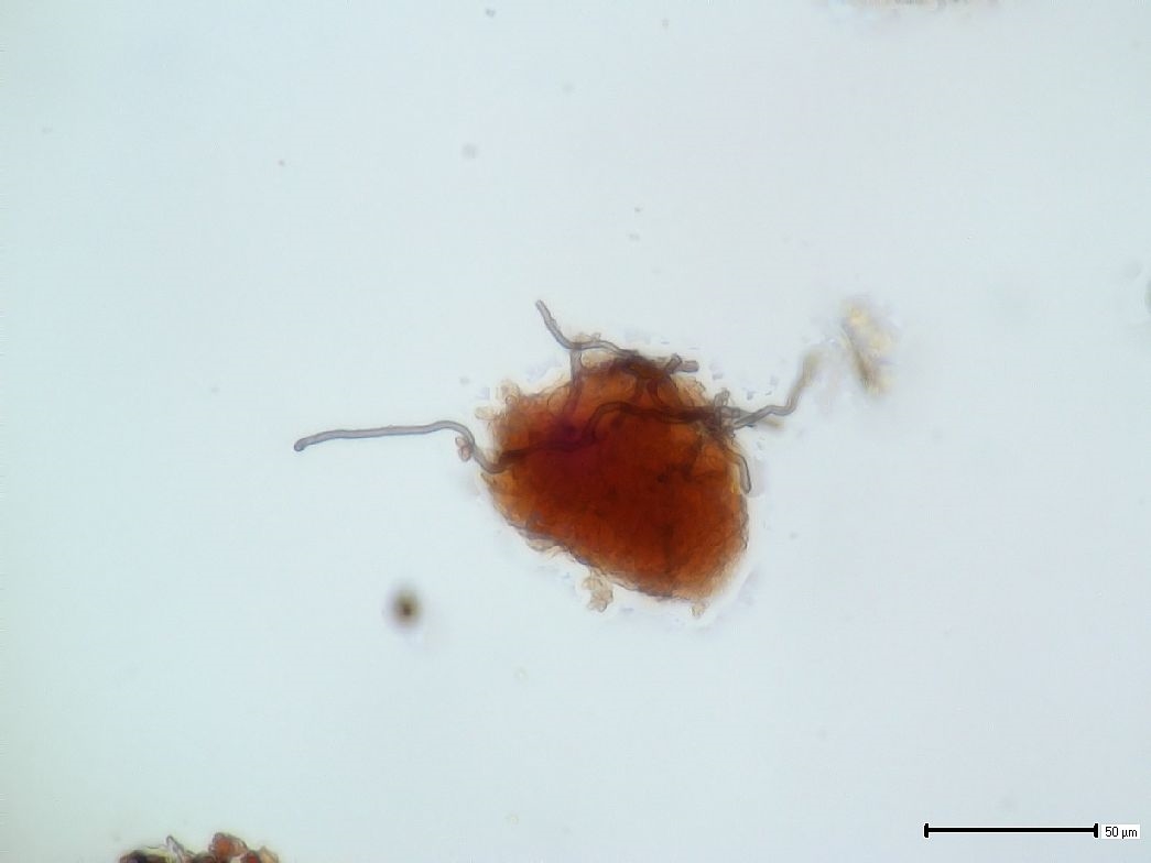 Ein wenig des bröckeligen, dunkelbraunen Materials wurde mit der Präpariernadel auf einen Objektträger gekratzt und dann mit einem zweiten Objektträger bedeckt und zerrieben. Ein Deckglas drauf, Ethanol unter ziehen lassen und ab ans Mikroskop ... erwischt!