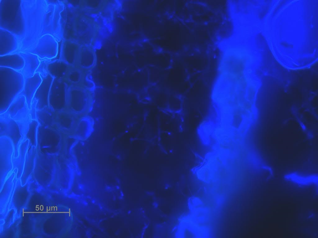 Um den Verlauf der Hyphen zu verfolgen, sind relativ dicke Schnitte nötig. Dann erhält man aber unscharfe und überstrahlte Fluoreszenzbilder, wegen der Anregung ober- und unterhalb der Schärfenebene liegenden Bestandteile. Bei dünnen Schnitten ist andererseits die Identifizierung der Hyphen schwierig, weil sie schräg angeschnitten sind und dann höchstens als schmaler, unspezifischer Ring erkennbar sind. Das folgende Beispiel mit einerm etwas dicker ausgefallenen und stärker gefärbten Handschnitt gehört noch zu den schöneren: