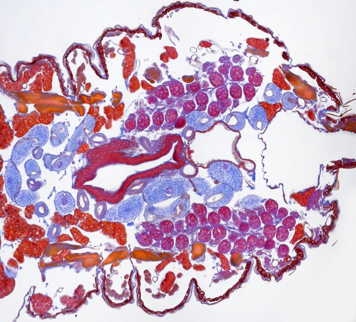 Die Ovariolen (im Bild blaurote Kügelchen) sind quer geschnitten, und liegen traubenartig am Ovidukt an, der als blaues fädiges Gebilde zu sehen ist . Die kreisrunden blauroten Kügelchen sind also Querschnitte durch die Ovariolen, nicht die Eier!.