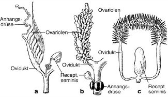Dargestellt sind verschiedene Ovarientypen bei den Insekten. Eine Vielzahl von Ovariolen hängt in verschiedener Weise an den Ovidukten an. Ich gehe davon aus, dass es auch bei den Milben so oder so ähnlich ähnlich aussieht.