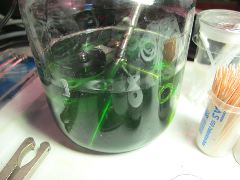 Um die Kleinteile in dem "Brackwasser" wiederzufinden, verwende ich ein 1-Euro Schreibtischutensilien-Set. Das stelle ich in die Behälter mit dem Lösungsmittel.