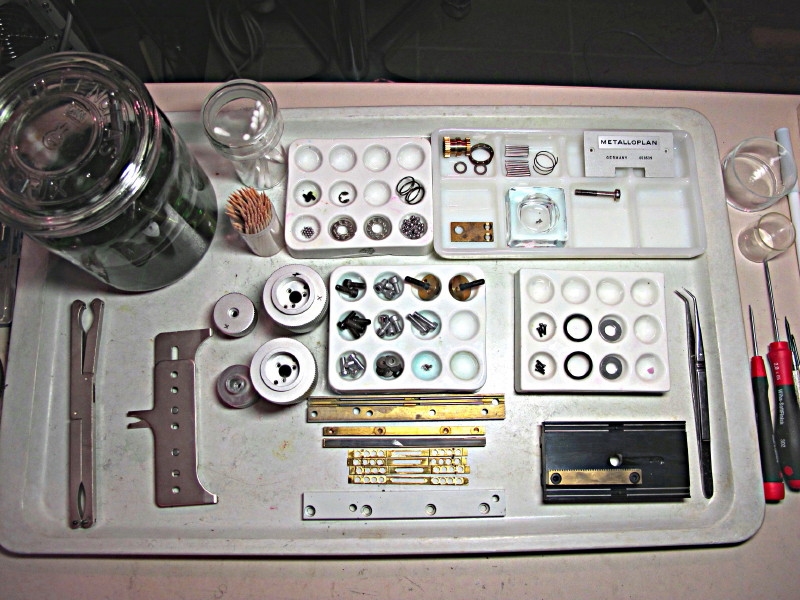 Mut gehört eigentlich nicht dazu, sondern ordentliches Werkzeug, jemanden mit Erfahrung und zusätzlich eine gute bebilderte Dok. Na ja und eine Warnliste, was man nicht machen soll, bzw. worauf man achten sollte. Wie bei mir am Start: Mikroskop unbedingt auf den Rücken legen! Die Angstwanne ist immer wichtig! Aber der Hinweis: Kugeln sind winzig ist auch schon nervenschonend! Ich habe tatsächlich keine Kugel verloren und die Nadeln des Nadellagers sind alle vorhanden. Sowas sammle ich immer mit einem "Rührfischentferner". Für die Nichtchemiker: ein langer teflonummantelter Stab mit Magnet vorne dran, mit dem Magnetrührstäbe aus Reaktionsgefäßen gefischt werden. Sehr praktisch!