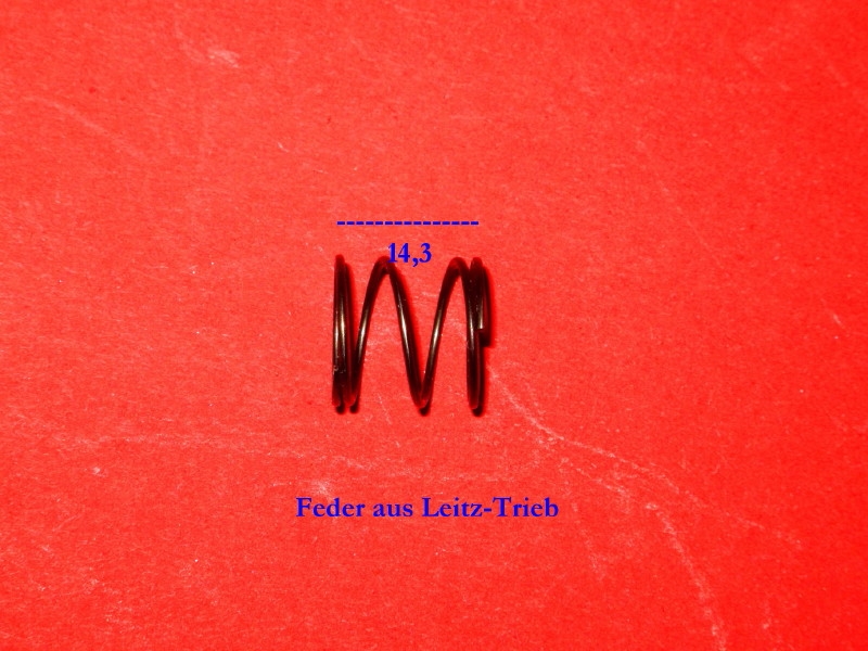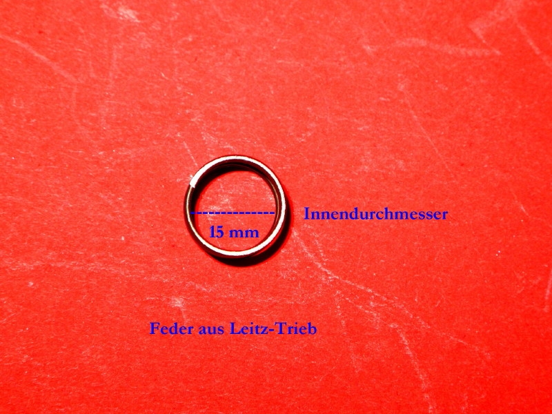 nun bin ich mit Fett versorgt und der Fernkurs wie baue ich wieder zusammen (Leiter: Frank Donat) läuft auch über Standleitung. Aber nun gibt es Probleme: 2 Kunststoffscheiben habe ich im Xylol verloren. Die sind Dank des fast gleichen Brechungsindex in dem Schmodder unter gegangen. Die habe ich jetzt aus PP nachempfunden. Aber Frank hat eine Feder ausgemacht, die nicht geeignet erscheint. Deshalb suche ich jetzt Ersatz. Sie sieht fast so aus, wie die angebildete, ist aber innen etwas weiter. Es gelten die angegebenen Maße. Hat jemand eine solche oder möglichst ähnliche? Der Innendurchmesser darf minimal 14,5 mm sein