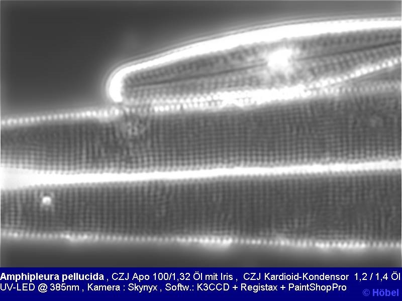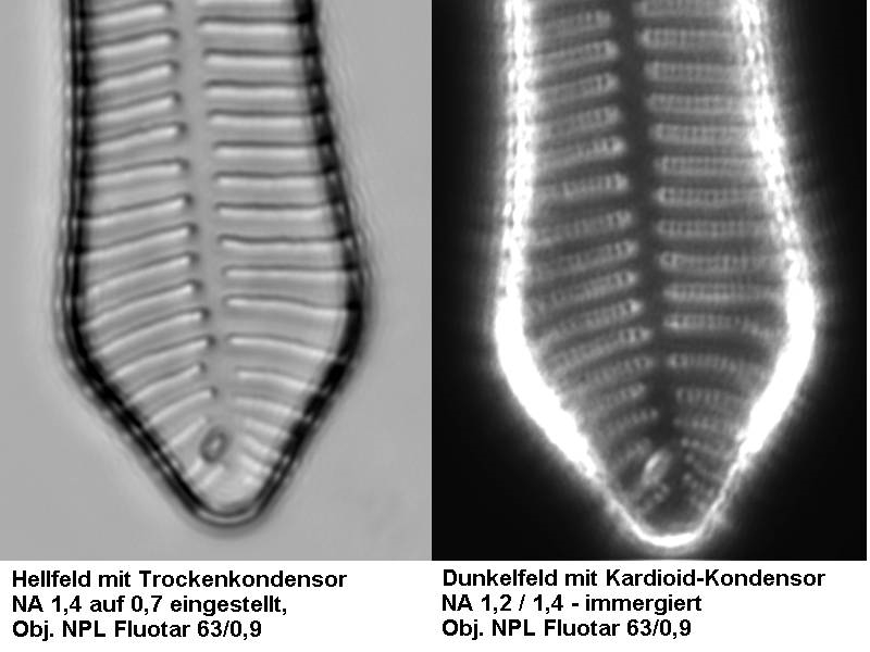 ich habe selbstverständlich einige Versuche mit dem für mich neuen (alten) Zeiss Jena Kardioid-Kondensor unternommen. So ist also im nahen UV auch bei Aperturen von < 1,2 eine Auflösung der "dots" bei A.pellucida teilweise möglich.