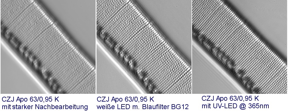 Bereits das Blaufilter BG12 hilft schon recht schön und übertrifft sogar die Ölimmersion im Kontrast. Greift man zur UV-Quelle so steigert man noch einmal die Auflösung und übertrifft auch rein theoretisch die Grenze der verwendeten Ölimmersion (Kondensor nicht immergiert).