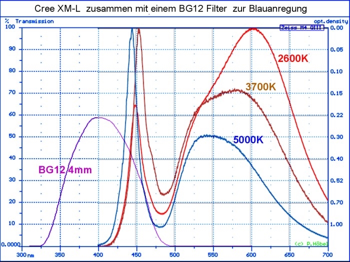 Die UV LED von Peter ist schmalbandiger als die BG12 Kombination. Um zu sehen, obe es wirklich an der Wellenlänge liegt oder an der Bandbreite, bräuchte es eigentlich einen Vergleich mit geicher Bandbreite aber anderer Wellenlänge. (Nein, ist keine Aufforderung zur Beschäftungungstherapie.... :))