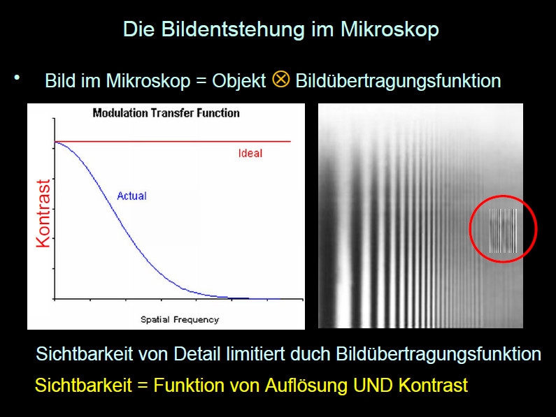 Welche abbildungsseitigen Beugungs-Maxima in das Objektiv eindringen können um somit zur Auflösung beizutragen hängt also zunächst einmal von der Apertur des Objektives ab!