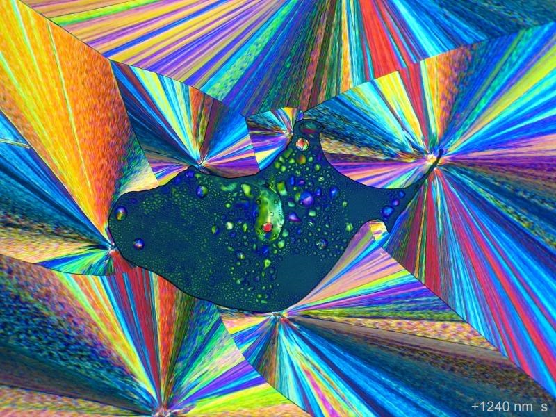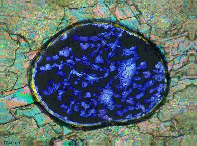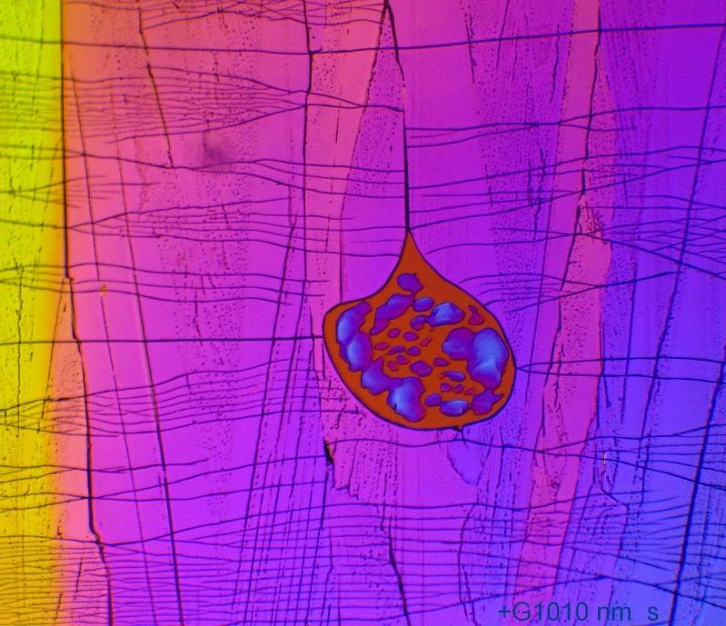 Die abgeschiedenen Kristalle sind viel dünner als die Masse außerhalb der Blase, daher waren die beiden Ebenen nur durch Stacken (Combine, 2 Bilder) scharf zu kriegen. Die Polarisationsfarben entsprechen dem mit einem viel höheren Gangunterschied außen.