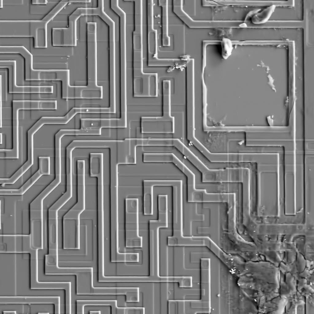 Ich bin unlängst das erste mal vor einem Rasterelektronenmikroskop gesessen und habe Aufnahmen eines integrierten Schaltkreises erstellt. Die Schaltung ist uralt (SN74LS47A von Texas Instruments) und der Die ist schmutzig/korrodiert.