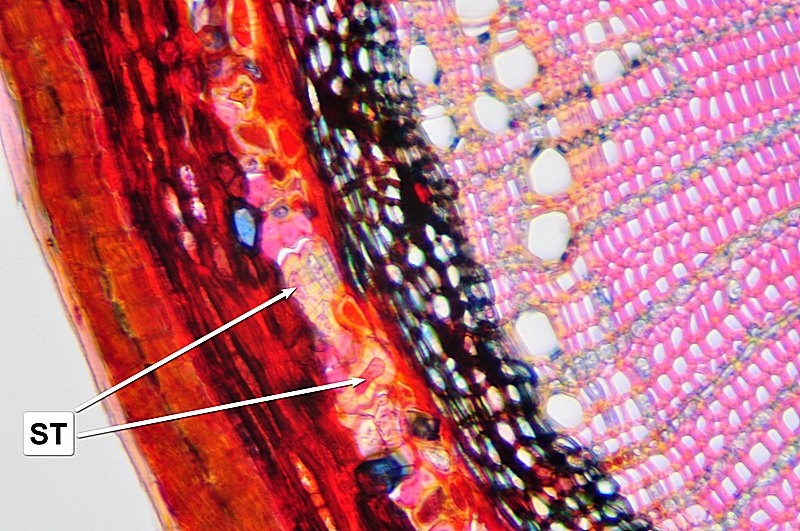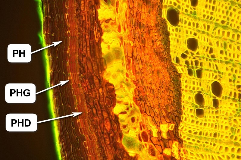 PH = Phellem (Kork – totes Gewebe), PHG = Phellogen ( Korkkambium), PHD = Phelloderm (parchymatisch – aktives Gewebe)