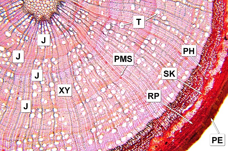 PE = Periderm, RP = Rindenparenchym, SK = Sklerenchym, PH = Phloem, PMS = primärer Markstrahl, T = Tracheen, XY = Xylem, J = Jahresringe.