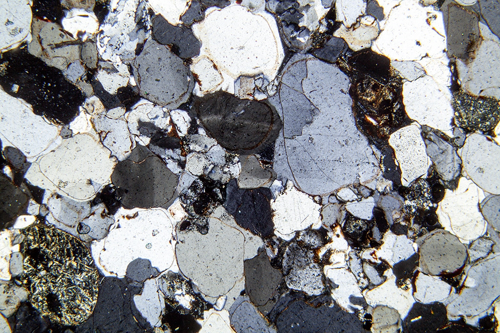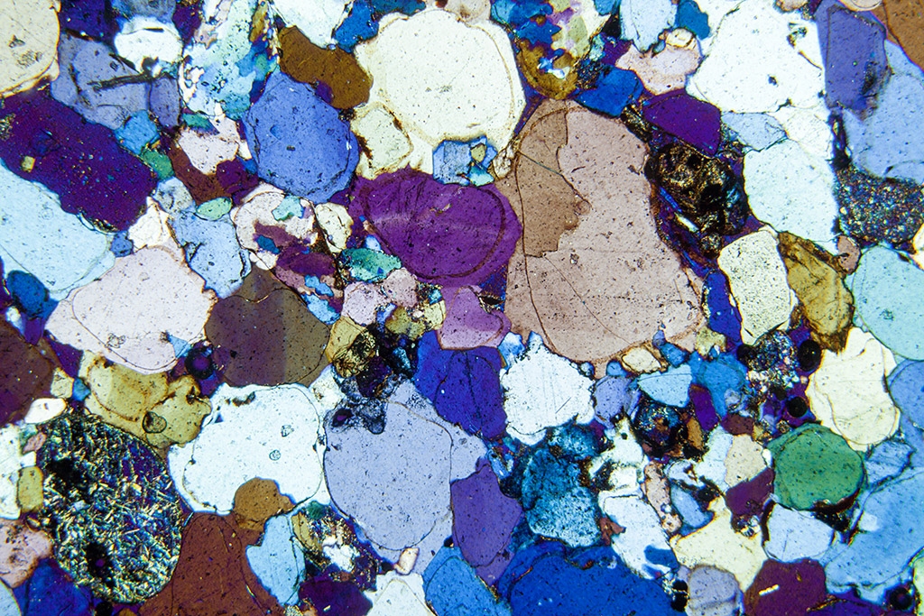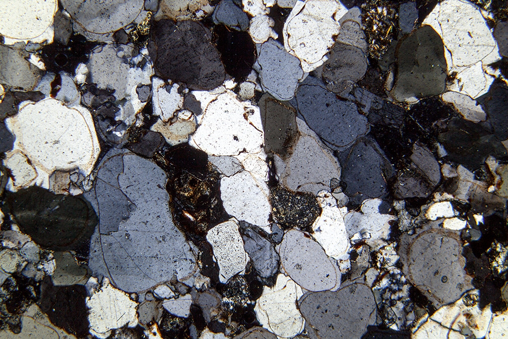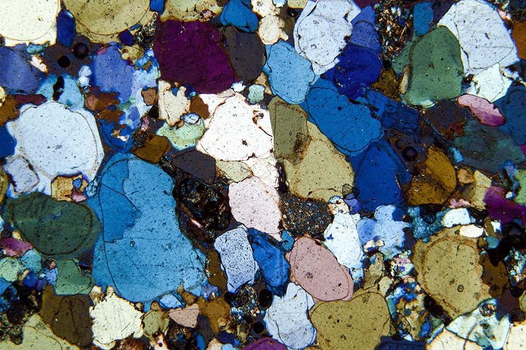Zum Glück für die Öl- und Gasindustrie, für die Länder mit den entsprechenden Vorkommen und damit auch für uns, wurden aber auch ein paar weniger stabile Minerale (z.B. Feldspäte) und Gesteinsbruchstücke (v.a. Vulkanite) mit eingebettet. In Deinem Schliff sieht man zwei davon etwas unterhalb der Mitte und eines am oberen Bildrand auf 1 Uhr. Im Kontakt mit tiefen, heißen Wässern wurden diese Körner zum Teil gelöst und gaben dem bis dahin extem dichten Sandstein wieder ein bisschen von seiner früheren Porosität zurück. Genug jedenfalls, um Platz für Öl und insbesondere Erdgas zu bieten, wie wir es auch in Deutschland fördern (bzw. aus den Niederlanden, Norwegen und Großbritannien kaufen). Kurz: Rotliegend-Sandsteine (und dieser sieht sehr danach aus) sind Europas wichtigstes Erdgas-Speichergestein.