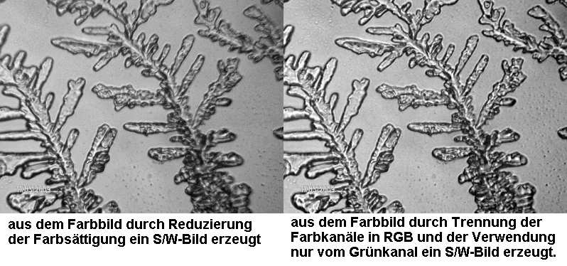 Wird nur durch Reduzierung der Farbsättigung, d.h. alle 3 Farbkanäle - ROT GRÜN BLAU - werden gemixt, ein neues S/W-Bild erzeugt, so tragen auch die teilweise störenden Farbelemente zum Bildaufbau bei - linkes Bildbeispiel.