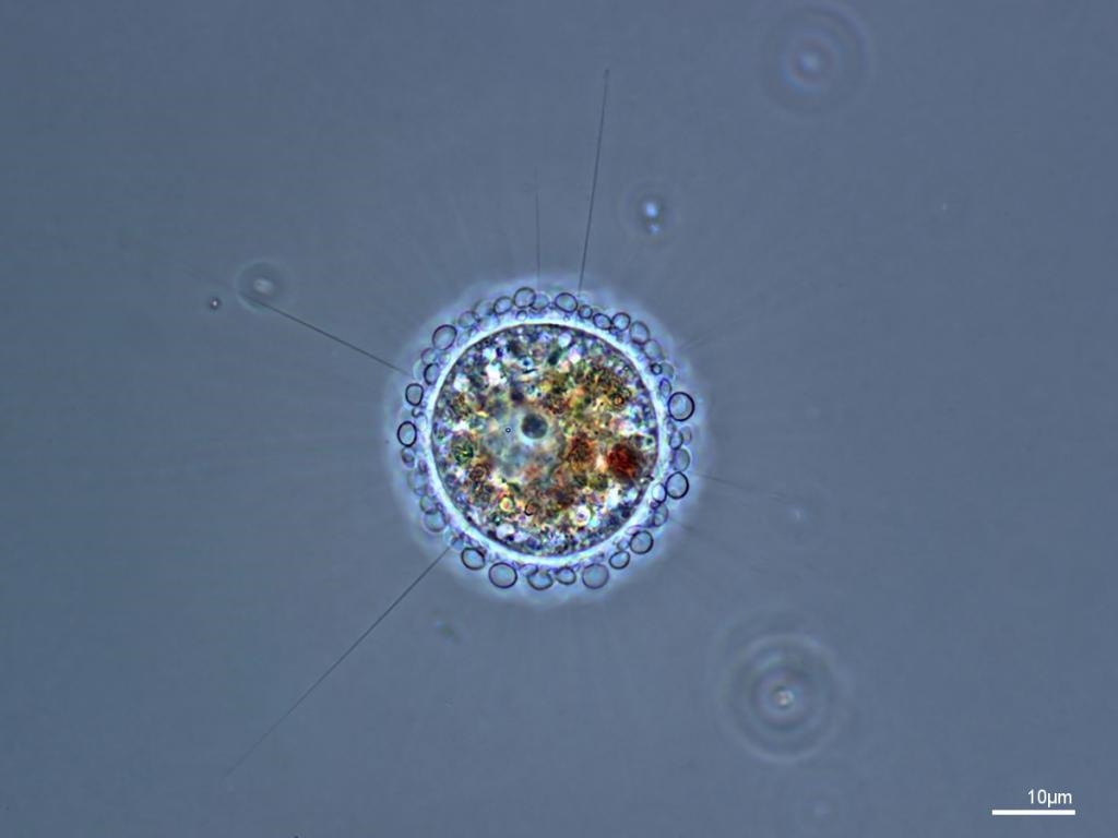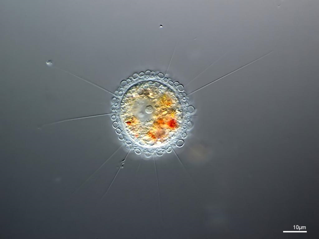 zu den schönsten Funden im Mikroskop gehört sicherlich Pompholyxophrys, die Perlensonne. Die Typusart der Gattung ist P. punicea, die im Jahr 1869 von Archer entdeckt wurde. Bis zum Jahr 1969 wurde diese Gattung zu den Heliozoen gezählt, obwohl charakteristische Eigenschaften der Heliozoen (Axoneme in den Pseudopodien, Kinetozysten) fehlten. Rainer (1968) erschuf die Gruppe Rotosphaeridia für diese "Pseudoheliozoen" und ordnete neben Pompholyxophrys Archer 1869 auch Lithocolla Schulze 1874, Pinaciaophora Greeff 1873 und Rabdiophrys Rainer 1968 dort neu ein.
