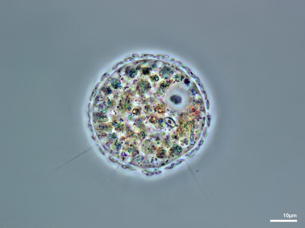 Perlen gehen schon mal verloren. Ich habe einzelne Perlen schon häufig gefunden, konnte sie bisher aber nicht einwandfrei zuordnen. Die Kugel auf dieser Epitheka eines Dinoflagellaten ist eine Pompholyxophrys punicea Perle: http://www.mikroskopie-forum.de/index.php?topic=20481.0