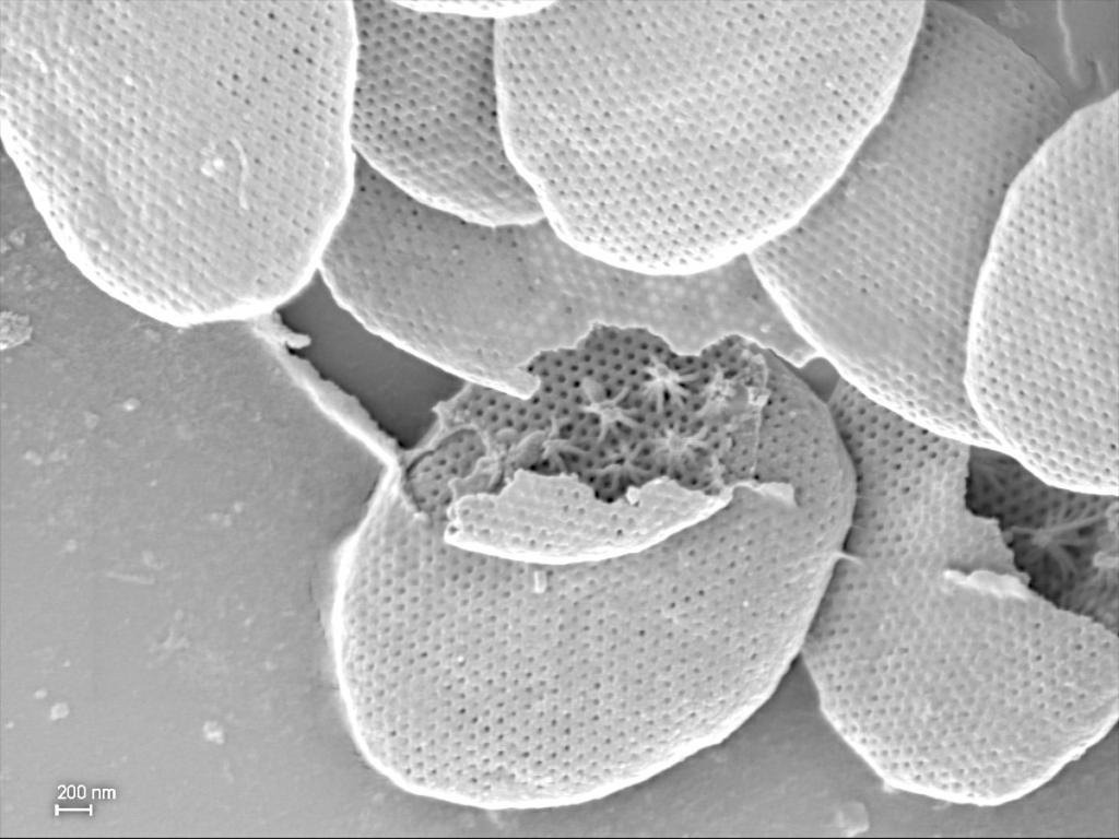 Den Vergleich zwischen Lichtmikroskop und REM bei Lithocolla Schulze 1874 gibt es hier: http://www.penard.de/Nucletmycea/Lithocolla/index.html