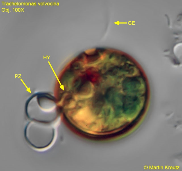 Neben diesem endoparasitischen Pilz in Trachelomonas hispida konnte ich auch noch einen exoparasitischen Pilz auf Trachelomonas volvocina beobachten. Hier erkennt man deutlich die außen auf der Gehäuseoberfläche anhaftenden Pilzzelle, von denen nach meiner Interpretation einen Hyphe, durch die Gehäusewandung hindurch, die Wirtszelle parasitiert: