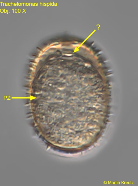 Nach meiner bisherigen Interpretation scheint der Pilz die Trachelomonas-Zelle ab einem gewissen Reifestadium aus dem Gehäuse der Wirtszelle herauszudrängen. Dieses Verhalten beschreibt Bernd Laber für Sphaerita endogena nicht. Interessanter Weise geschieht dies nur selten durch die bereits vorhandene Gehäuseöffnung, sondern meist seitlich in der vorderen Gehäusehälfte. Bei einem Foto erkennt man auch geißelartige Strukturen (mit ,,?" gekennzeichnet), von denen ich nicht sagen kann, ob sie zur Pilzzelle gehören oder ob es eine Art Membran ist, die man im optischen Schnitt sieht. Ich konnte diesen ,,Ausstoßungsvorgang" häufig beobachten. Mir ist kein vergleichbarer Vorgang bei einem Pilzbefall unter Protozoen bekannt.