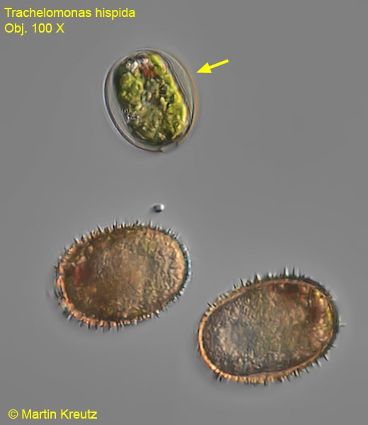 einige Arten der Gattung Trachelomonas sind in meinem bevorzugten Fundort Simmelried so häufig, dass sie mir manchmal fast die Sicht versperren. Ich versuche das Gewimmel immer mental auszublenden. Jedoch bemerkte ich vor einigen Wochen in einer alten Probe, dass manche Zellen eher bräunlich als grünlich erschienen. Ich habe mir die Sache dann mal näher angeschaut. Die Population in dieser Probe bestand hauptsächlich aus Trachelomonas hispida: