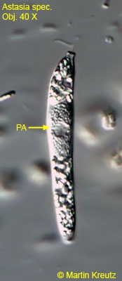 Die Zellen werden ca. 25 – 35 µm lang, haben einen kurzen Kragen und sind mit mehr oder weniger gut ausgebildeten, kegelförmigen Stacheln besetzt. In einigen Zellen konnte ich jedoch einen hochbrechenden Fremdkörper erkennen, bei dem es sich um einen parasitischen Pilz handelt:
