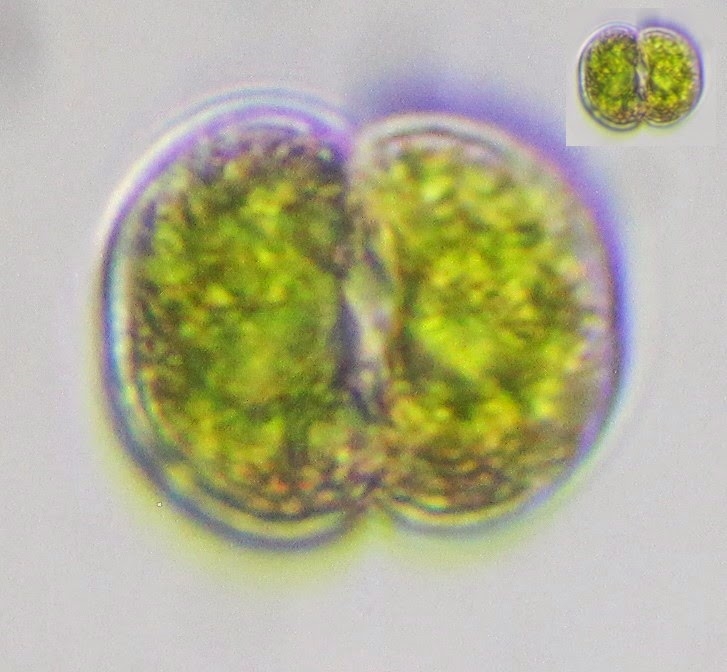 weder ist bei den meisten Cosmarium-Arten eine Gallerthülle im Hellfeld erkennbar, noch treten die Zellen dieser Gattung in 4er oder 8er Formationen auf, so wie hier offenbar vermutet wird (warum?).