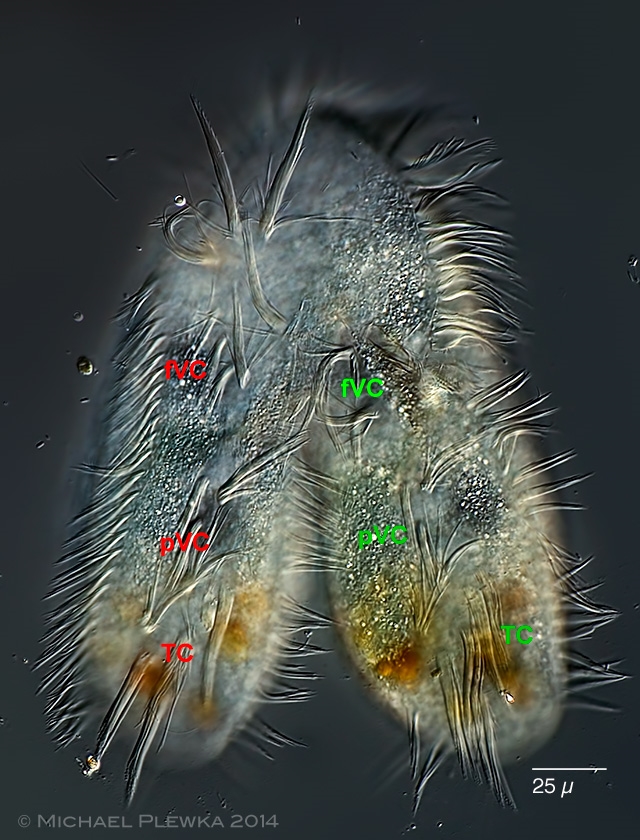 In der letzen Aufnahme liegt der Fokus auf den Cirren der Ventralseite. Erkennbar und zuzuordnen sind die Termilalcirren (TC), die postoralen Ventralcirren (pVC) und die frontalen Ventralcirren (fVC), für das linke Individuum rot (backbord), für das rechte Individuum grün (steuerbord) markiert.  Nun bleiben im vorderen (= ,,oberen") Bereich dieses Paares einige Cirren (Frontalcirren und Buccalcirren) übrig. Gerne hätte ich herausgefunden, zu welchem dieser Individuen diese Cirren gehören. leider war das nicht möglich (s.o.).