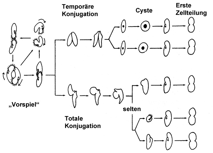 soweit war auch mein -eben auf Anregung durch die Bilder angelesener- Kenntnisstand für den normalen Ablauf. Wenn die Konjuganten aber -jedenfalls längere Zeit - zusammenbleiben, ist es dann auch so, dass die Makronuklei verschwinden und aus den Mikronuklei wieder je zwei Makronuklei und zwei Mikronuklei gebildet werden, so dass das Vereinigungsprodukt dann längere Zeit mit je zwei Kernen weiterlebt? Oder wird für die Zeit des Zusammenlebens  die Meiose und Mitose gestoppt, oder  leben die vereinigten Konjuganten längere Zeit mit nur zwei Mikronuklei ohne neue Makronuklei herauszubilden? Oder wird für die gesamte Vereinigungsform zunächst ein einziger Mikro und ein Makronukleus gebildet und die Nuklei teilen sich spãter bei der Trennung?