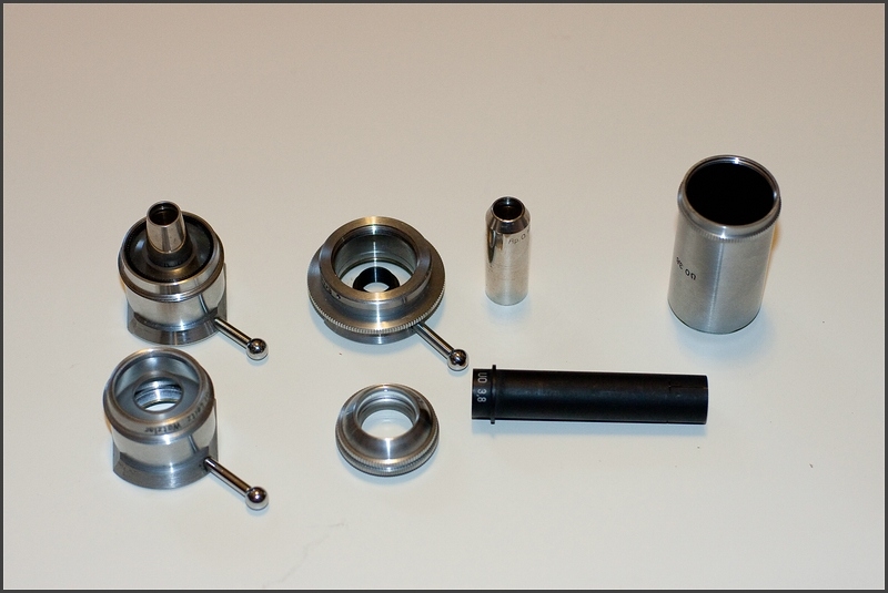 Untere Reihe: Normales Objektiv ohne Objektiveinsatz, der eigentliche Kondensor, Hülse für das Objektiv