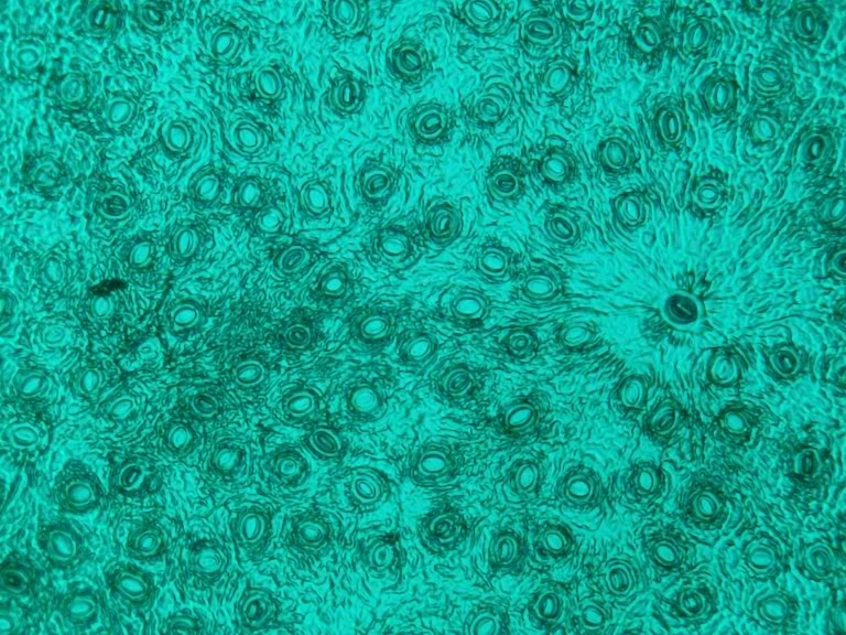 Das Blatt wurde, wie in historischen Büchern dargestellt, über den Finger gelegt und dann unter dem Stemi, 7x vergrössert, mit der Rasierklinge flächig geschnitten. Es gibt gute Gründe es sorgfältig zu tun, man will ja keine Blutspuren am Präparat. Leider wird der Schnitt so nicht gleichmässig dick. Doch meist lässt sich ein passende Stelle finden. Ein weiteres Problem ist, dass die Spaltöffnungen noch mit Luft gefüllt sind und schwarz unter dem Mikroskop erscheinen. Hier hilft es, mit dem Bleistift leicht auf das Deckglas zu trommeln.